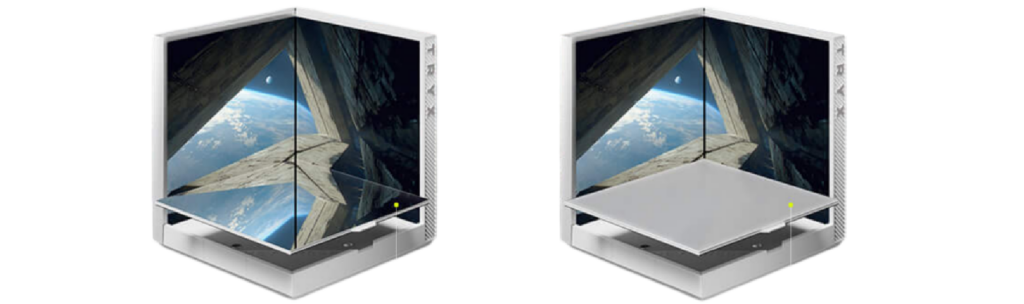 A base do TRYX Stage é composta por dois displays e uma base de espelho, e oferece duas configurações de aspecto, onde a base de vidro espelhado pode ser invertida e magneticamente encaixada ao contrário como uma superfície com um acabamento mate.