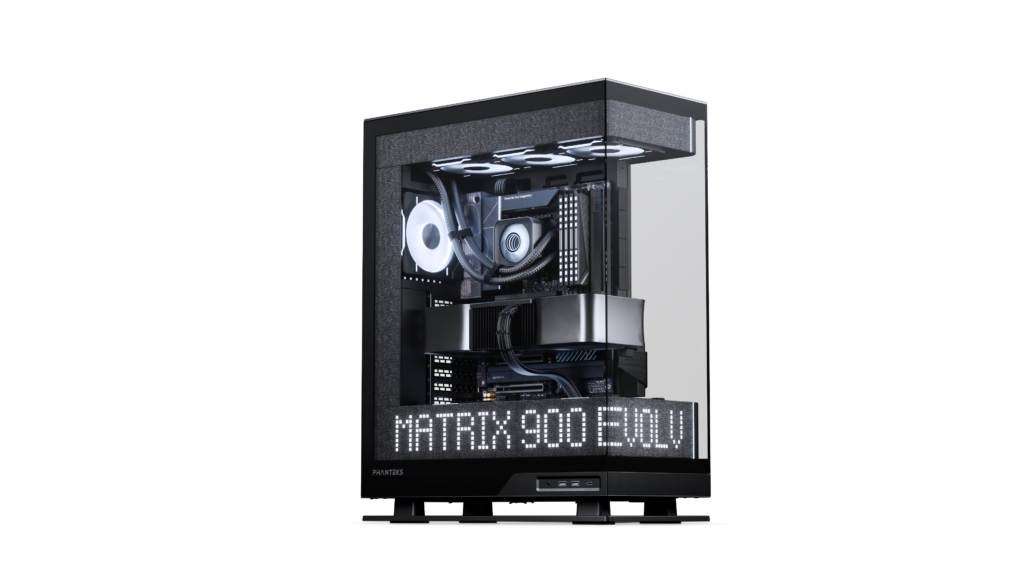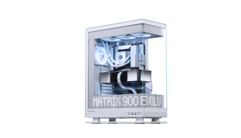 A Phanteks Evolv X2 Matrix é também uma versão melhorada de uma caixa pré-existente, a Phanteks Evolv X2, que vimos pela primeira vez em janeiro de 2025. Ao contrário da XT View Matrix e do Kit Matrix-600, a Evolv X2 Matrix vem com um ecrã de 900 LEDs. Este ecrã envolve tanto o painel frontal como o lateral na parte inferior da caixa, podendo ser observado através do vidro temperado cristalino. Com 300 LEDs extra, a Evolv X2 Matrix oferece ainda mais área de ecrã para widgets de visualização personalizados.