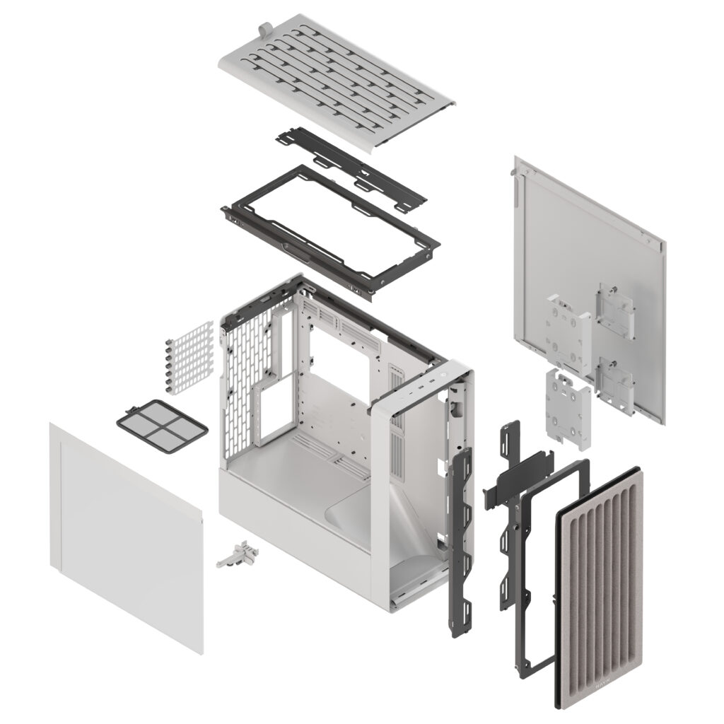A caixa para PC HAVN BF aproveitou o melhor das caixas HAVN HS 420 para simplificar a instalação e a manutenção. Possui um design de estrutura semiaberta e uma estrutura rígida em forma de U. Os painéis superior e frontal são mantidos no lugar com ímanes, e o painel superior possui ainda uma pequena alça para facilitar o acesso. Além disso, as ranhuras emborrachadas ao longo das bordas do painel tornam a remoção e a remontagem intuitivas.