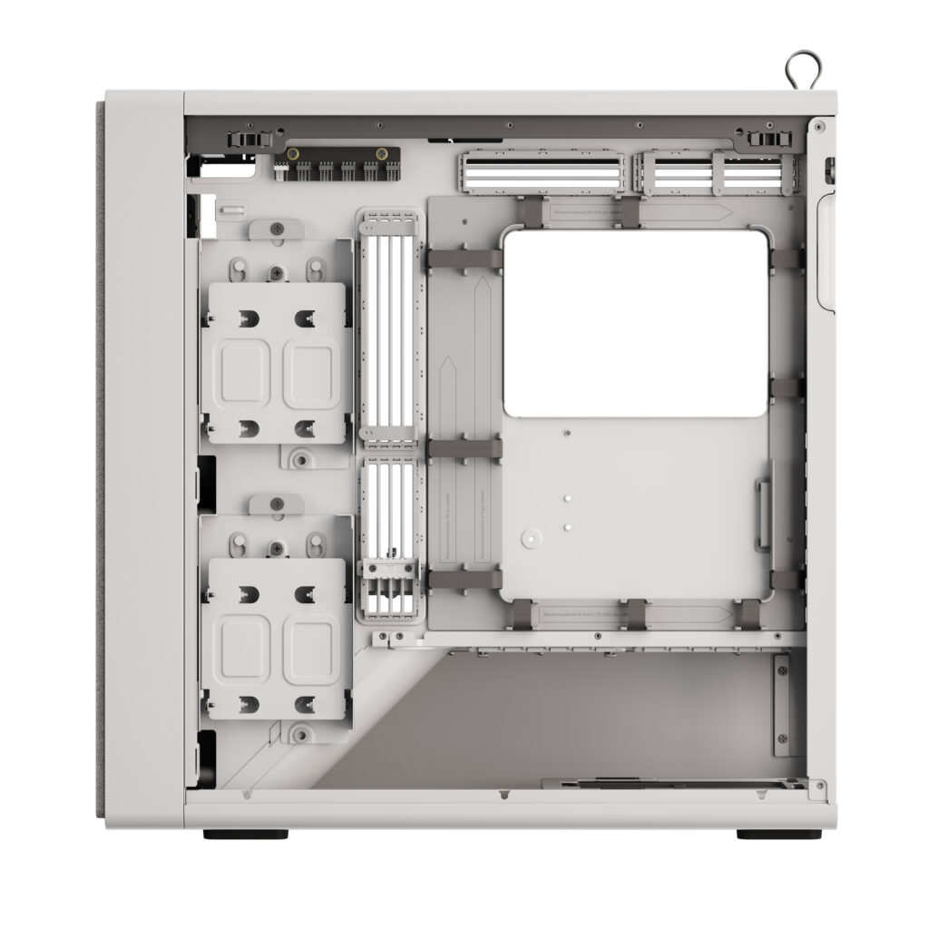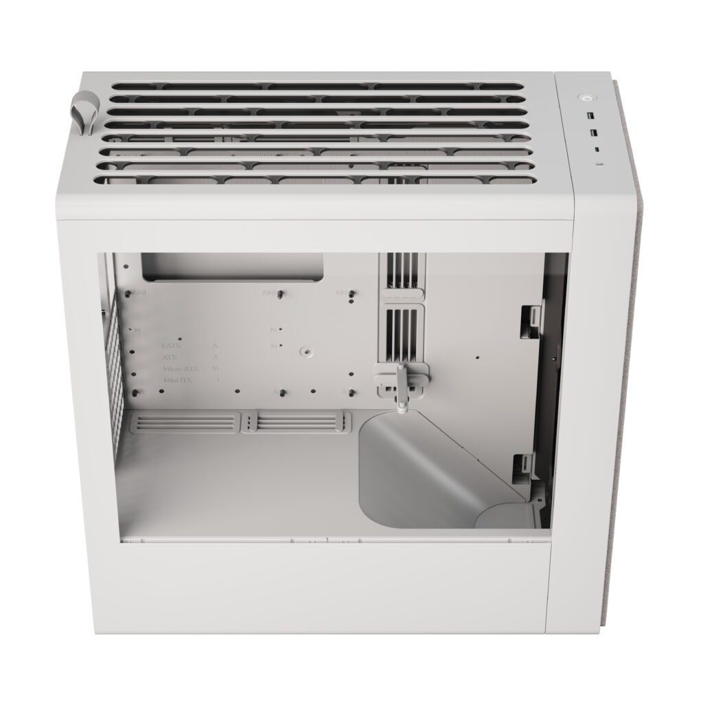 Atrás da rampa guia de ar da GPU, há espaço para uma fonte de alimentação ATX de até 200 mm de comprimento, para maior compatibilidade com o mercado de PSUs. Além disso, a parte traseira da bandeja da motherboard tem duas montagens para compartimentos de unidade. Os compartimentos de unidade incluídos podem suportar um HDD de 3,5” ou dois SSDs de 2,5”, e ambos possuem amortecimento de vibração integrado para reduzir o ruído de operação.