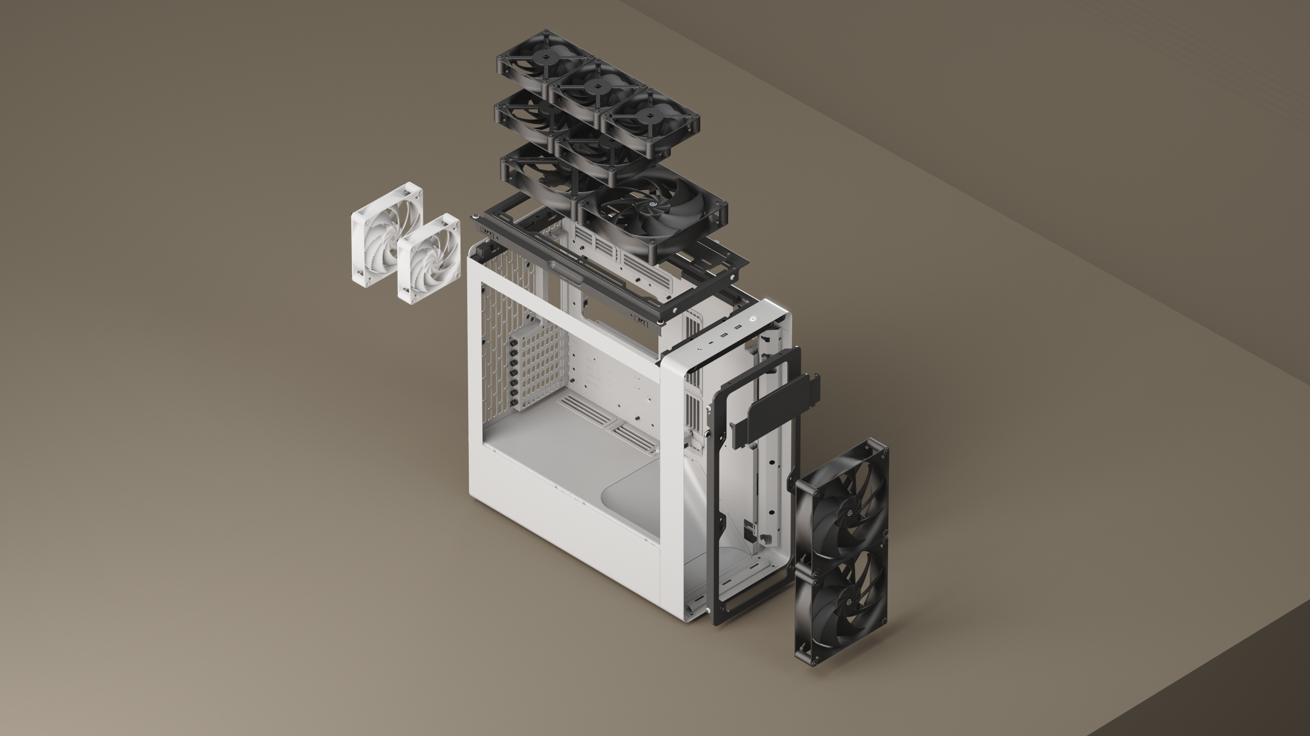 Isto é combinado com uma altura livre de 195 mm para a CPU. Como resultado, podes construir uma solução de arrefecimento abrangente que oferece um desempenho térmico incrível usando sistemas de refrigeração a ar ou a água. Melhor ainda, cada suporte de ventoinha possui recursos antivibração, como suportes de isolamento de borracha, para minimizar o ruído e melhorar a estabilidade.