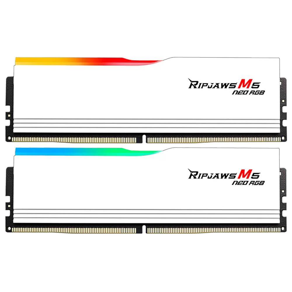 A série Ripjaws M5 Neo RGB apresenta-se com um design minimalista e moderno, agora num acabamento em branco mate impressionante. Este kit é a escolha perfeita para builds temáticas "Snow" ou claras, combinando a velocidade vertiginosa da DDR5 com uma estética refinada que eleva o visual de qualquer setup de gaming.