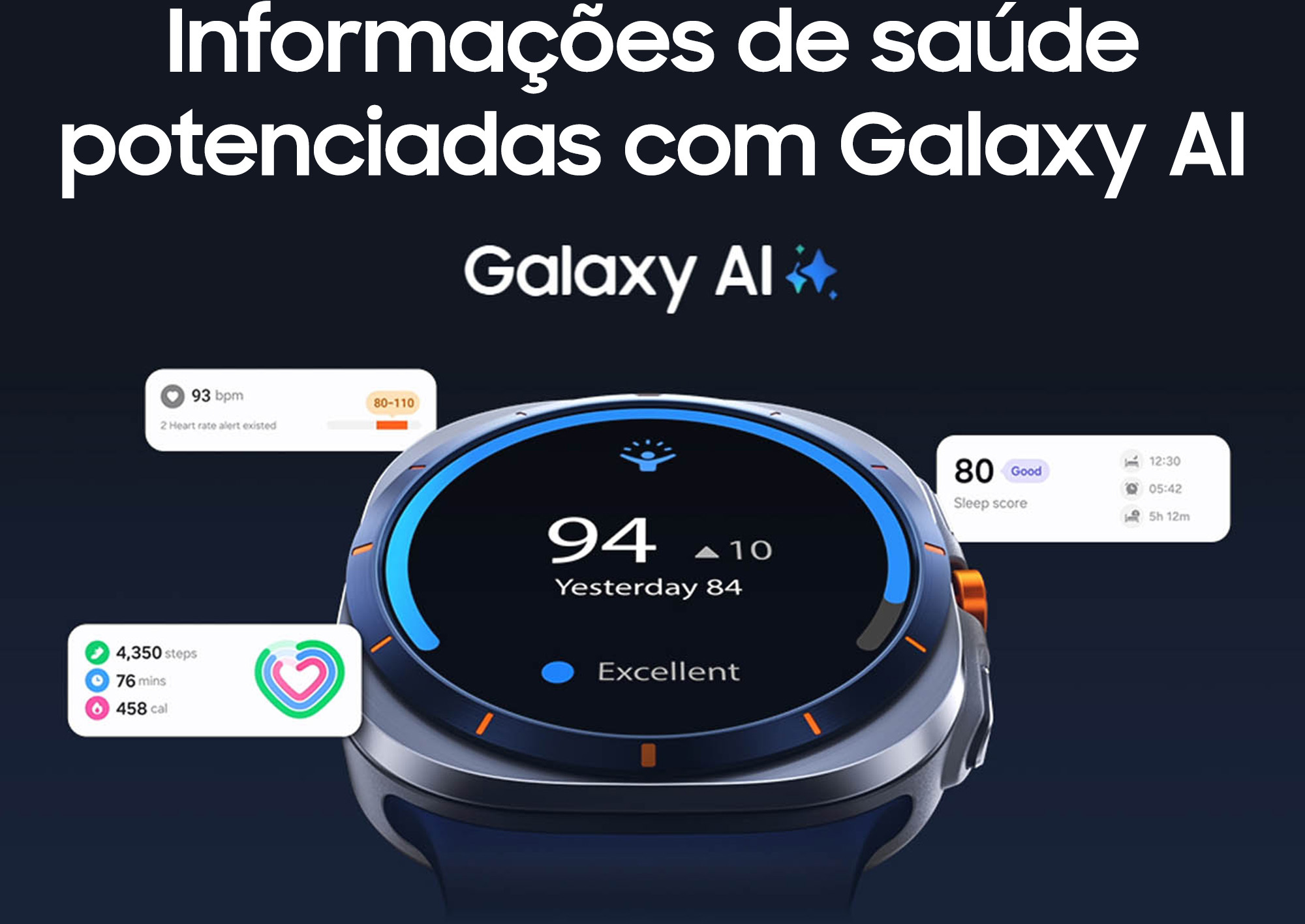 O Galaxy Watch Ultra é o smartwatch Samsung mais avançado de sempre. Desenhado para os amantes de atividades de exterior, é o Galaxy Watch mais resistente, combinando o vidro de safira com a dureza e leveza do titânio. Além disso, pela primeira vez incorpora funções exclusivas Galaxy AI que que melhoram o rastreio de saúde. Se gosta de aventura, o Watch Ultra não o deixará indiferente.