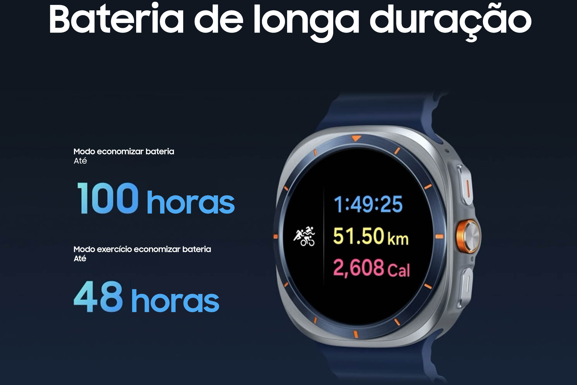 O Galaxy Watch Ultra renova-se por completo para integrar mais eficiência em diversos sistema comode Dual GPS, o sensor biométrico e bateria, o nosso ecrã mais brilhante e novas opções de treino e rotas GPX. Tudo isso no seu pulso.