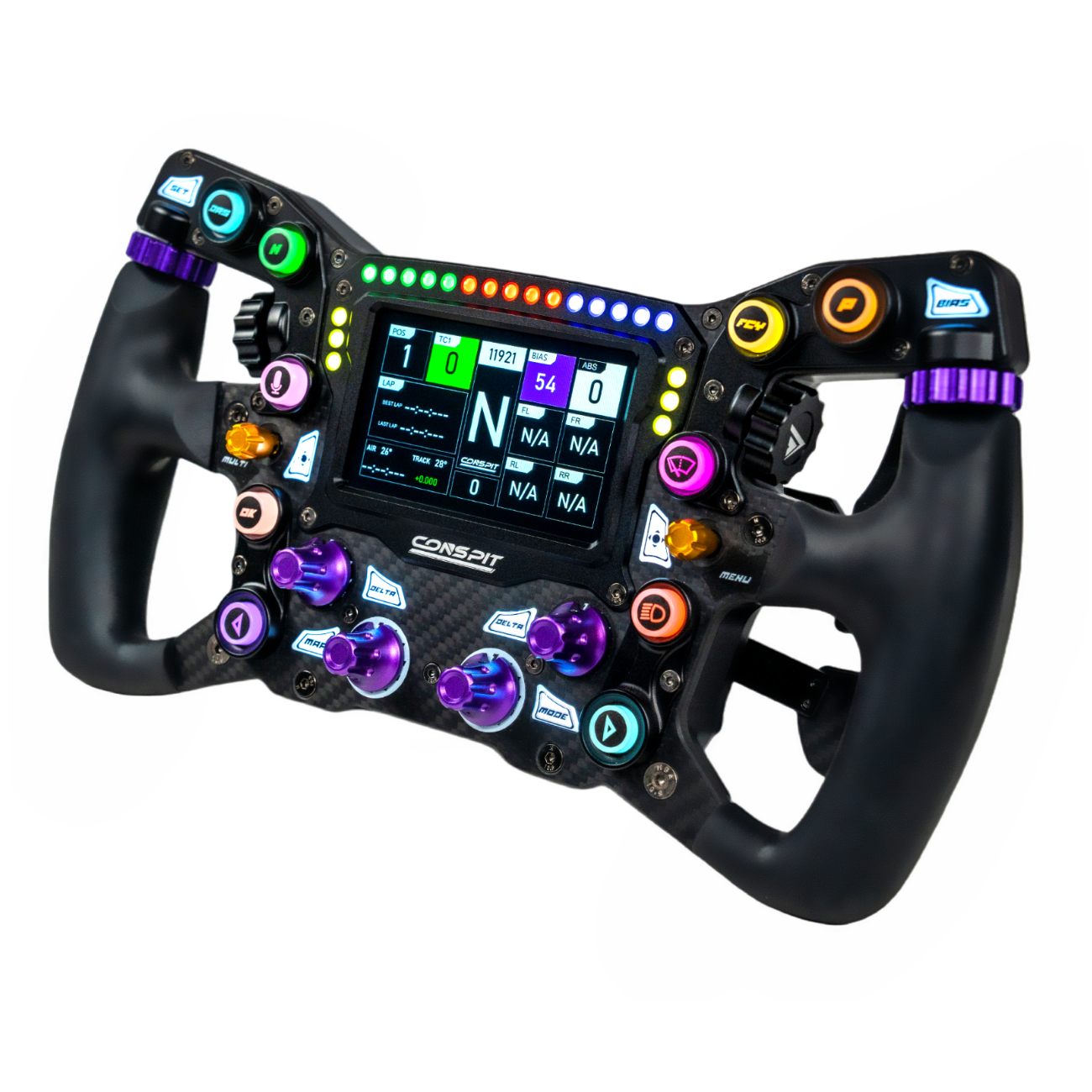 O CONSPIT MAX01 eleva a imersão com o seu ecrã tátil integrado, que suporta páginas de telemetria nativas e é 100% compatível com SimHub. Além do ecrã, o volante possui 21 LEDs de painel programáveis e 10 botões "ErgoTouch" com retroiluminação RGB independente, permitindo identificar instantaneamente funções como DRS, ABS ou bandeiras de pista. O design inclui encoders de polegar de estrutura aberta, operáveis por ambos os lados para ajustes rápidos durante a corrida.